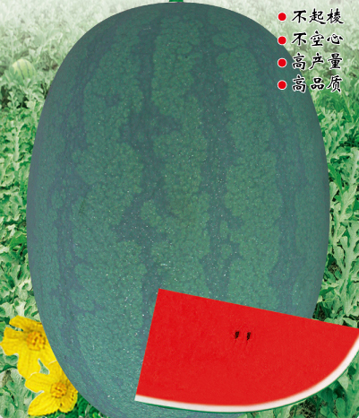 ■ 特征特性 :早熟種,雌花開放果實(shí)成熟28天左右。全生育期90天左右。植株長勢穩(wěn)健,抗病抗逆性強(qiáng),適應(yīng)性廣,易坐果。果實(shí)橢圓形,果皮墨綠色底上覆暗條帶,果面光滑無棱帶蠟粉。瓤色深紅,瓤質(zhì)酥脆,中心糖14%左右,口感好,風(fēng)味佳。平均單果重8-10kg左右,大者20kg以上(特殊栽培),一般畝產(chǎn)6000公斤以上。皮厚1.0cm左右,果皮硬度強(qiáng),耐儲運(yùn)。