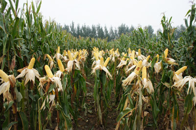 田間表現(xiàn):株型緊湊,葉片上沖,株高265-280厘米,穗位100厘米,穗長(zhǎng)21-25厘 米,穗粗6厘米,紅軸,籽粒黃色,馬齒型,出籽率90%,百粒重43.2克。莖稈堅(jiān)韌,根系發(fā)達(dá),高抗倒伏。無(wú)禿尖,抗旱,耐澇,特抗病。