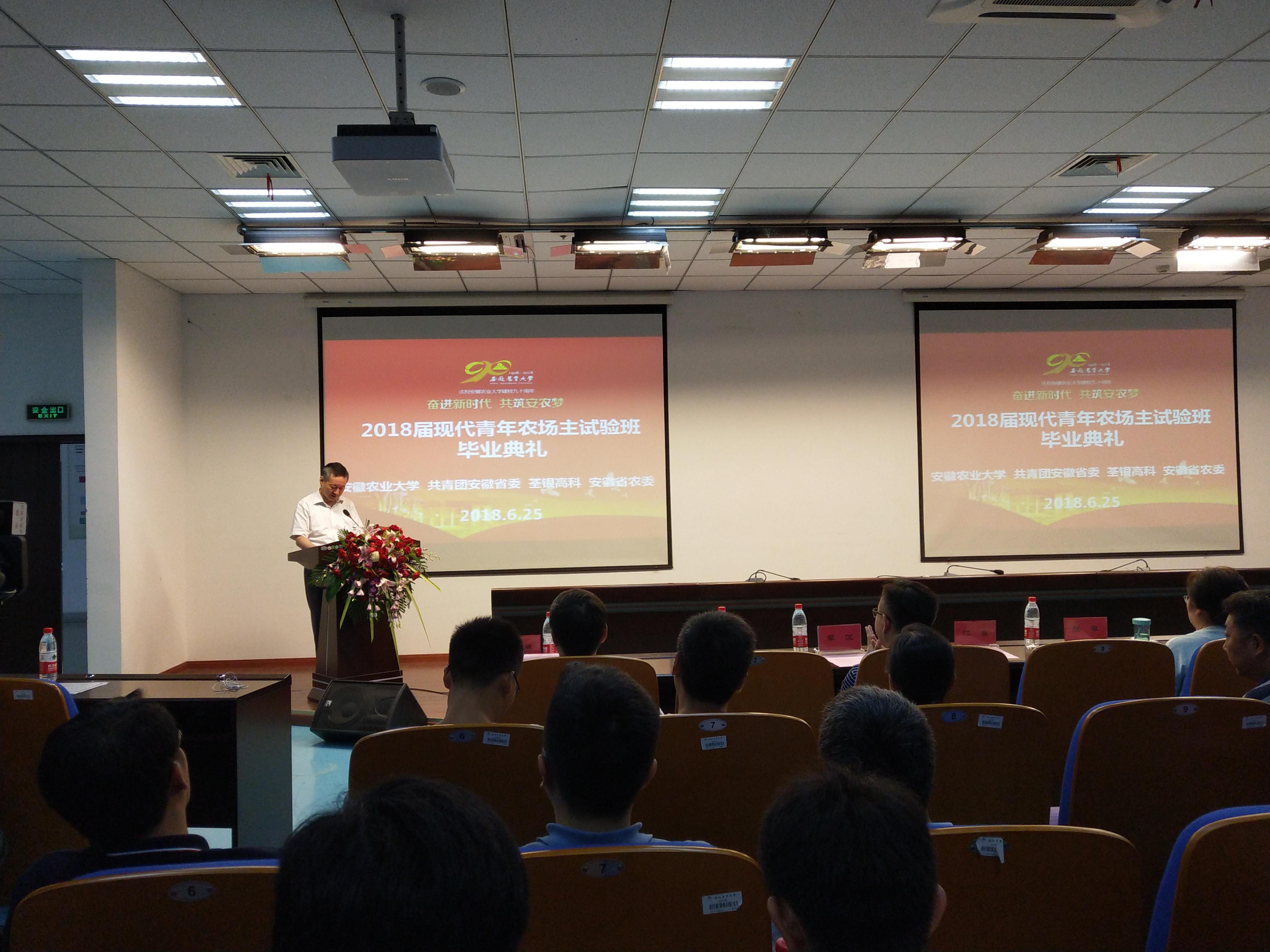 ??? 2018年6月25日上午,2018屆團(tuán)校企“現(xiàn)代青年農(nóng)場(chǎng)主”荃銀創(chuàng)新創(chuàng)業(yè)試驗(yàn)班畢業(yè)典禮在安徽農(nóng)業(yè)大學(xué)舉行。安徽農(nóng)業(yè)大學(xué)黨委書記江春,共青團(tuán)安徽省委員會(huì)副書記李波、荃銀高科董事長(zhǎng)張琴出席畢業(yè)典禮。安徽農(nóng)業(yè)大學(xué)副校長(zhǎng)馬傳喜主持畢業(yè)典禮。巽風(fēng)湖創(chuàng)業(yè)孵化基地總經(jīng)理佘良東、荃銀高科定遠(yuǎn)創(chuàng)業(yè)孵化基地負(fù)責(zé)人羅干以及安徽農(nóng)業(yè)大學(xué)相關(guān)處室、學(xué)院等單位主要負(fù)責(zé)人、部分現(xiàn)代青年農(nóng)場(chǎng)主試驗(yàn)班的任課老師、2018屆現(xiàn)代青年農(nóng)場(chǎng)主試驗(yàn)班畢業(yè)生、2015級(jí)和部分2016級(jí)現(xiàn)代青年農(nóng)場(chǎng)主試驗(yàn)班學(xué)員參加了畢業(yè)典禮。